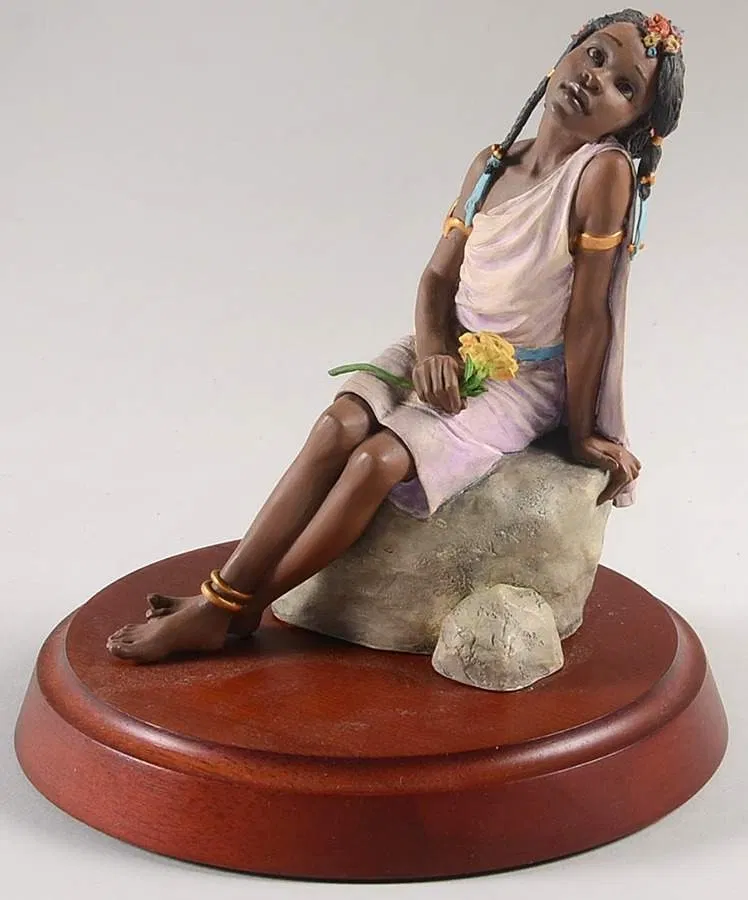 "I always knew I wanted to create Ebony Visions'. As an artist who happens to be black, I had distinct ideas about what I would like to see in the line." The elegant compeling figurines he created for the collection are a blen of both Art Nouveau and African culture, which Thomas calls "Afro-Nouveau." - Thomas Blackshear .Thomas Blackshear introduced Ebony Visions in April 1995 with the release of the first six Ebony Visions designs, The Storyteller, The Protector, The Nurturer, Siblings, Madonna and Tender Touch. Since then, Thomas Blackshear has created many new designs to add to the Ebony Visions collection. Thomas Blackshear's Ebony Visions collection is a master work of romantic symbolism. As with his paintings, these sculptures demonstrate Thomas Blackshear's incredible sense of design, unique eclectic style, and extraordinary mastery of color. Elegant drapery and delicate detail tantalize the eye while revealing each sculpted form. Thomas Blackshear's Ebony Visions depicts a full range of emotions that are both powerful and at the same time subtle. He deliberately portrays his Ebony Visions figures in a timeless setting in order to transcend a specific time, place, or culture. This unique collection of limited edition figurines emphasizes the beauty of the human form and symbolizes universal aspirations and ideals of humankind depicted through images that reflect the unique characteristics of the African American culture. For centuries classical beauty has been portrayed predominantly by white artisans who represent white subjects in their art. In this romantic and subtle tour de force, Thomas Blackshear creates a new vision of beauty and human emotion, an Ebony Vision.