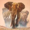 “Elephants,” says Guy Combes, “are to the Amboseli National Park what wildebeest are to the Mara/Serengeti, which is to say that the environment suits them perfectly. The juxtaposition of forest on the slopes of Mount Kilimanjaro and the plains and swamps of the Amboseli lake basin are an Eden for the elephant who rotate on a daily basis, moving en masse to the most abundant food supply. On the way back to camp one day I found myself directly in the way of a gathering of several herds, numbering around 300 in total, that were making their way down from the mountain to the swamp to cool off in the midday heat. They were so absorbed in reaching the water that they were oblivious to my presence and simply walked around my parked vehicle where I had resigned to sit and wait. There was simply nowhere to go to get out of their way and even if I had tried I feared I might provoke one of the large males. I was inspired to paint one of these bulls walking towards me through the dust, his head nodding and swaying with great and elegant movement, followed by several females and young. This now ranks at the top of my many experiences that have left me in complete awe of the scale and majesty of nature and I will revisit this scene many times again in my mind and most probably on canvas.”