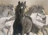 In Judy Larson’s Flight, a herd of wild horses races away from the droning aircraft circling above. This method of rounding-up mustangs such as these is part of the program to further cull the 33,000 horses still living in the wild in 10 Western states. Another 30,000 are already in captivity. The Bureau of Land Management wants to cut this total number of horses by half!