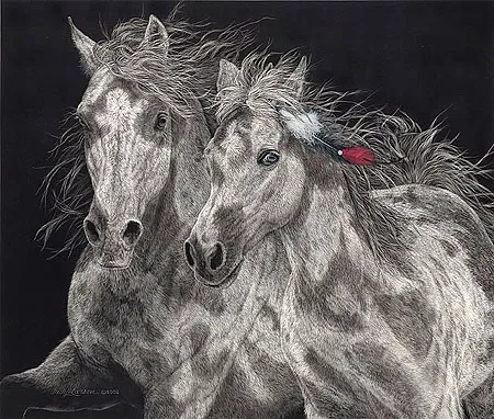 Judy Larson always knew she was going to be an artist. She was surrounded by them as a child, and was particularly inspired by her father, a professional illustrator. Judy received a Bachelor of Science degree in Commercial Art from Pacific Union College in Northern California, then spent the next 17 years as a commercial artist, illustrator and art director. In 1988, influenced by her love of nature and animals, Judy devoted her time to wildlife art. Her primary focus in each of her paintings is the animal, with the horse as a recurring subject. Her unique approach to her work is through the use of scratch board--a technique that can render magnificent detail but one requiring infinite patience. Scratch board, an old, but little used medium, consists of a smooth, thin surface of hardened China clay applied to a board. The subject is then painted solidly with black India ink to create a silhouette. Now the exacting work begins, engraving the image into the surface of the artwork. While many artists use steel nibs or engraving tools, Judy prefers to work with X-acto blades, changing them ever few minutes to produce as fine a line as possible. Once the subject has been totally scratched, it is a finished black and white illustration, ready for the artist to add color. The methods of adding color are diverse. Judy prefers a combination of airbrush, gouache or acrylics for finishing, with frequent rescratching for detail. Scratch board is a demanding medium, one that Judy has used masterfully in developing her unique approach to wildlife art.